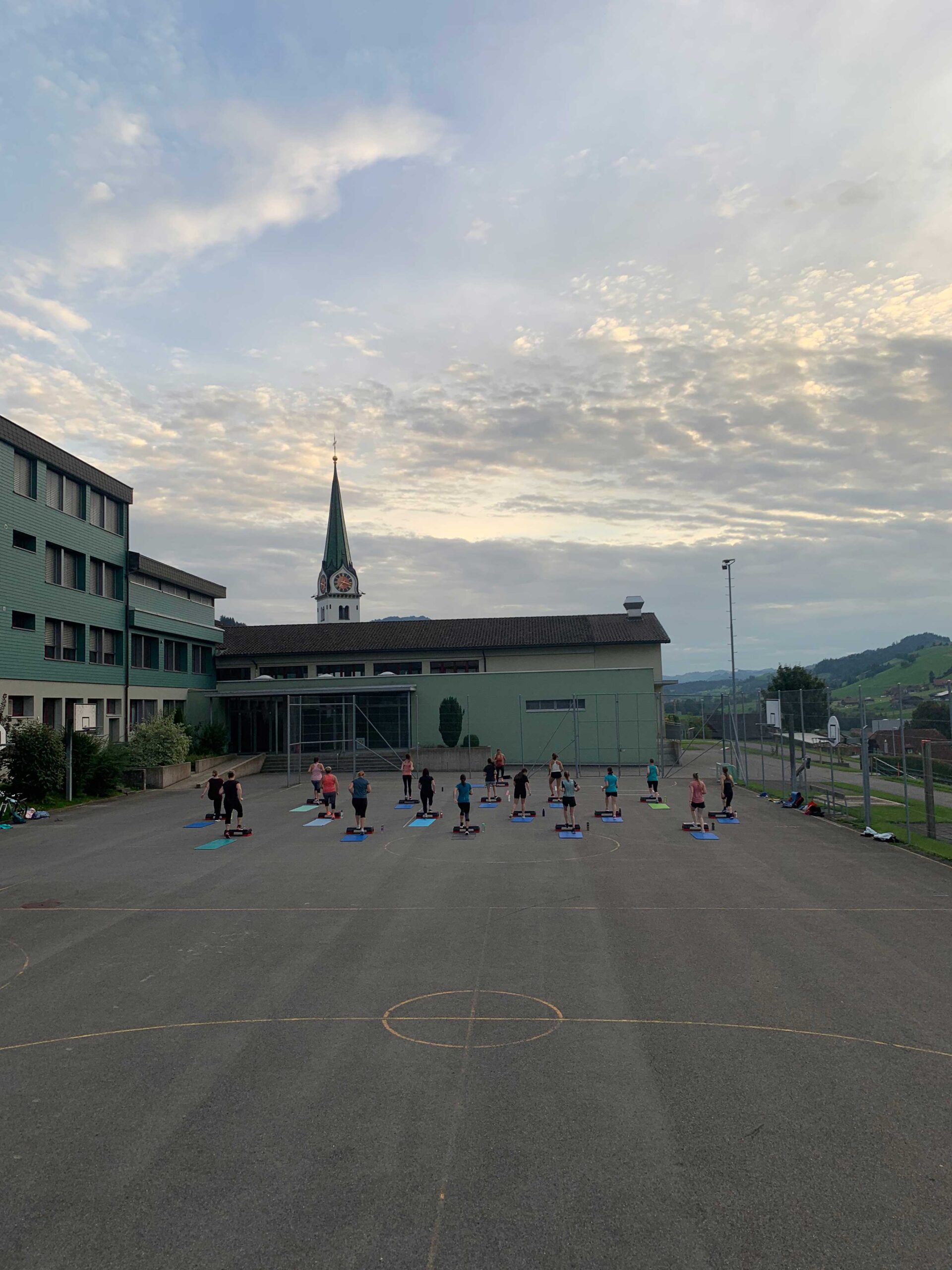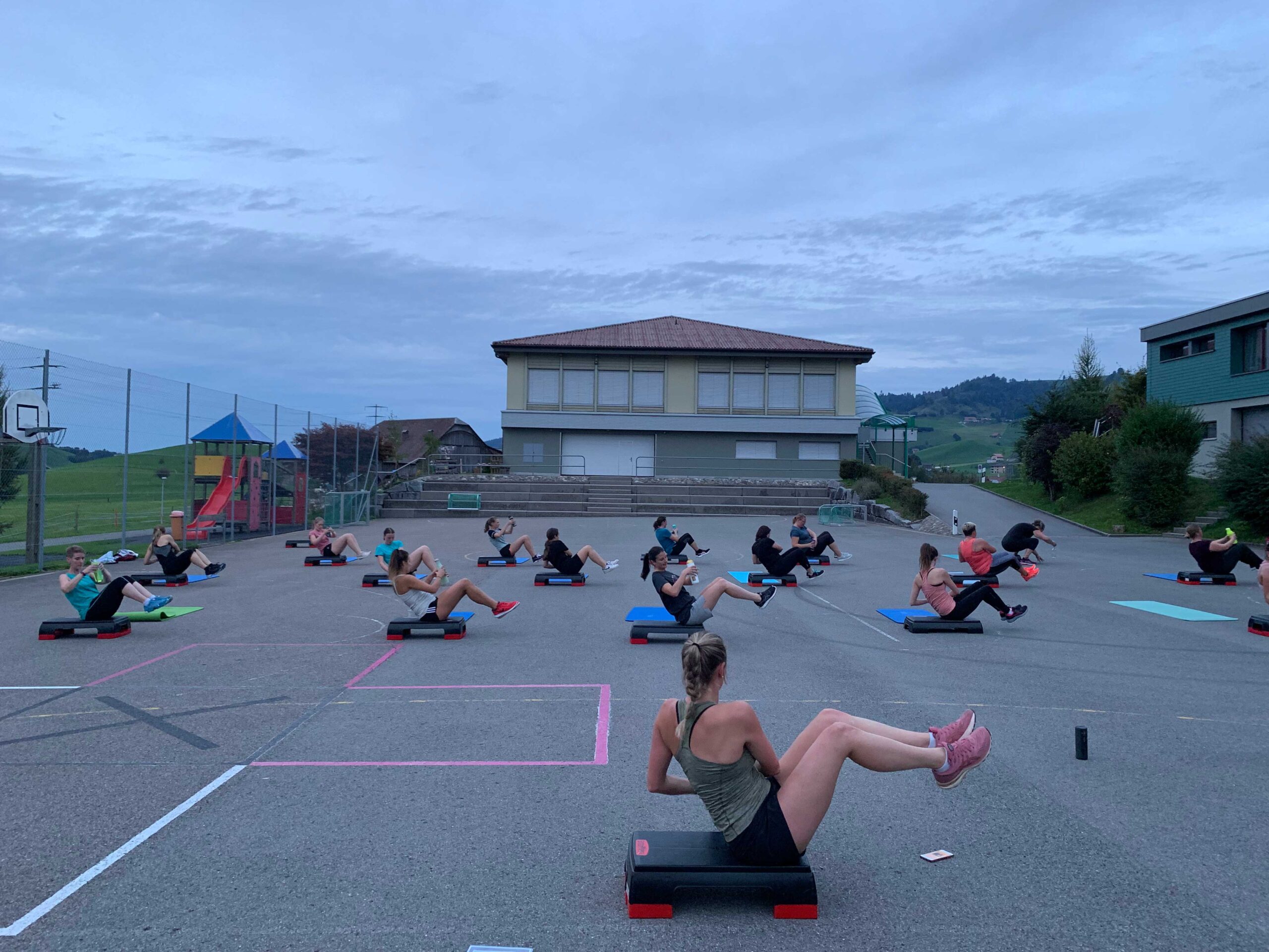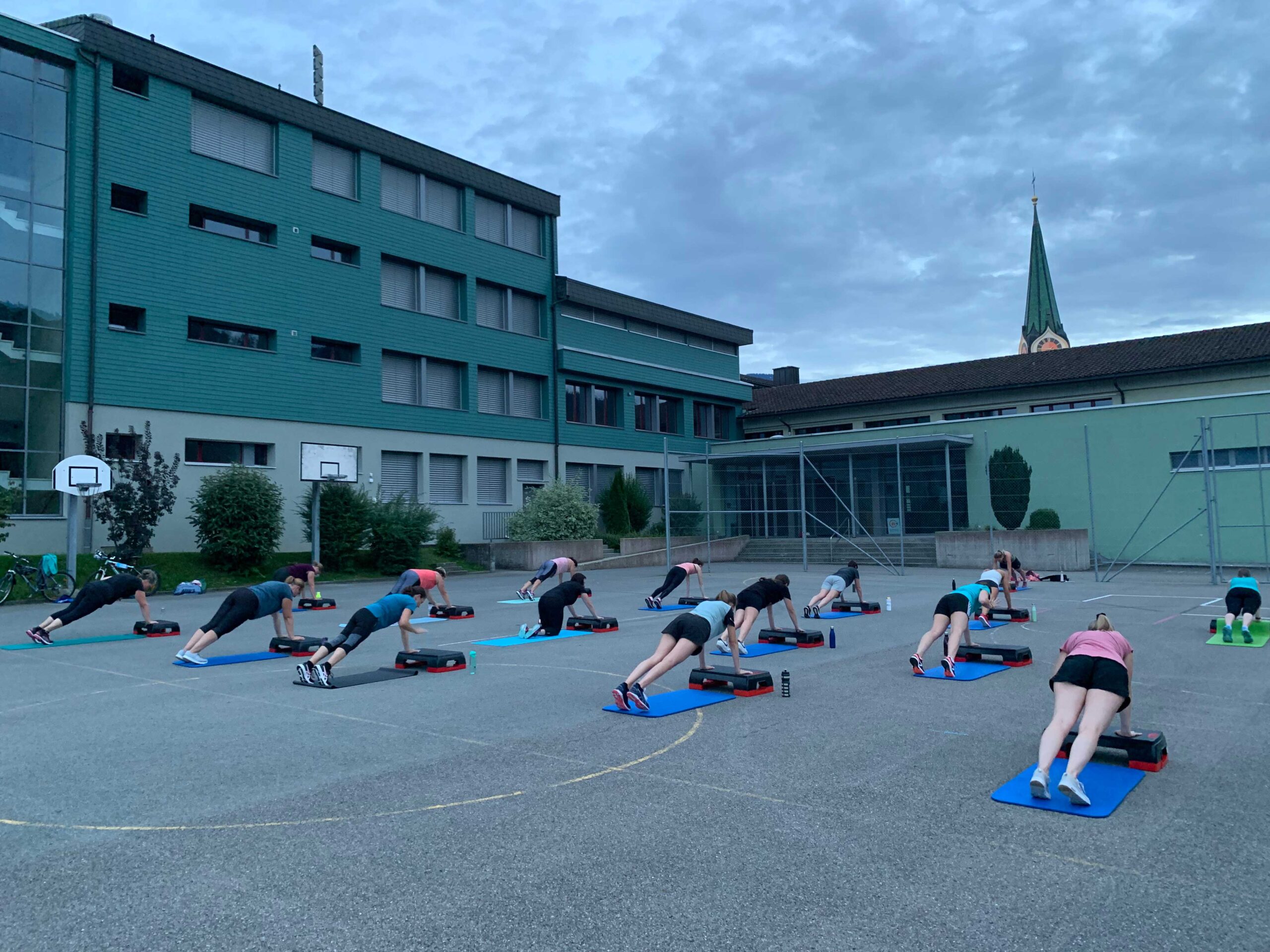 Bei schönem Wetter trai­nieren wir an der frischen Luft auf dem Schul­haus­platz. Bei Regen sind wir in der oberen Pausenhalle.